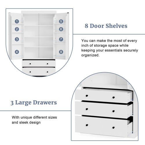 Adjustable Shelves, 8 Door Shelves, 3 Drawers for Kitchen, Dining Room, White