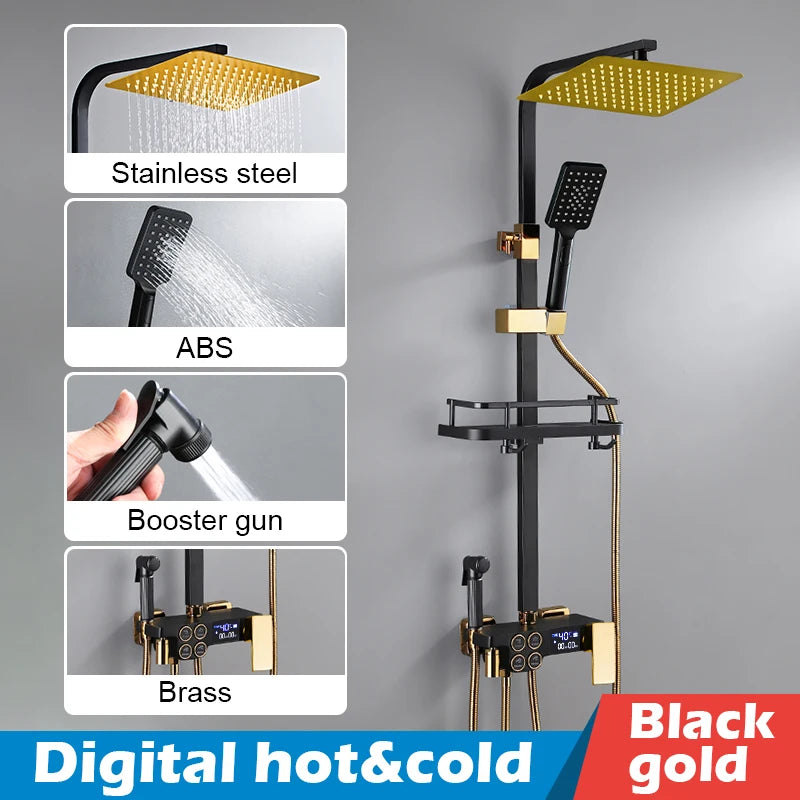 Bathroom Shower Set Black Gold Rain Shower Faucet Thermostatic Digital Display Shower Mixer Taps Copper Shower Systems for Bath