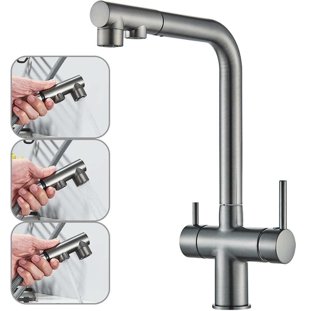 Filtered Kitchen Sink Faucet with Pull Down Sprayer 2 Handle 3 in 1 Water Filter Purifier Faucet Dual Sprayer Drinking Water Tap