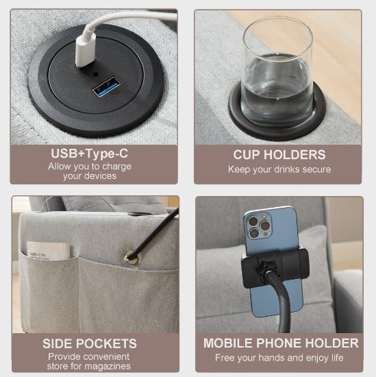 USB and Cup Holders: This sofa features one USB charging port and one Type-C port on the left armrest, suitable for various charging cables, providing continuous power for your phone. The cup holder design on the seat back conveniently holds drinks and cups. Additionally, the sofa has four side pockets and built-in cup holders to perfectly meet your daily needs, allowing you to enjoy convenience at any time.