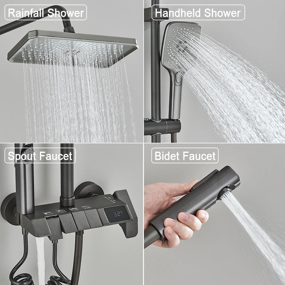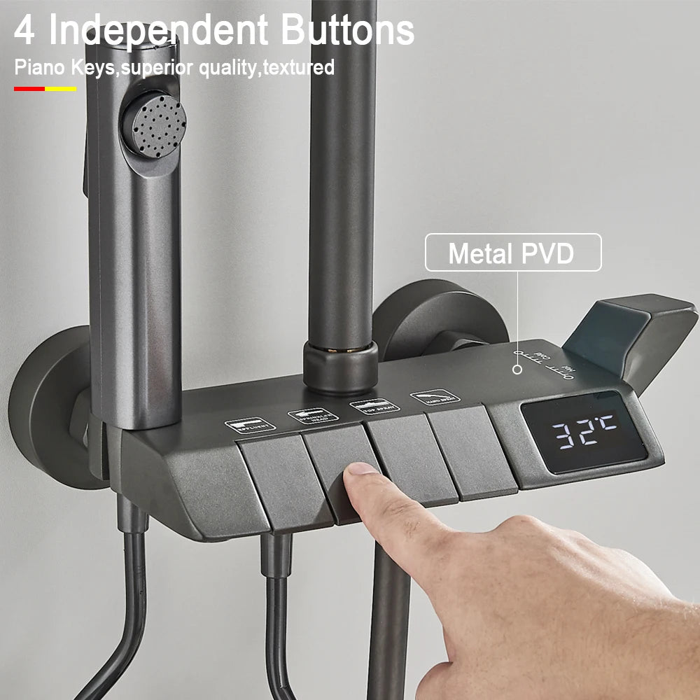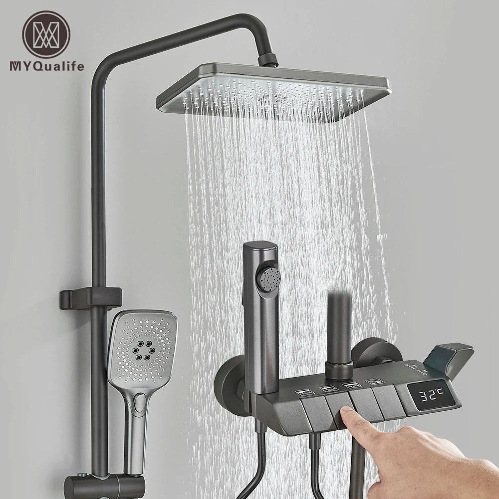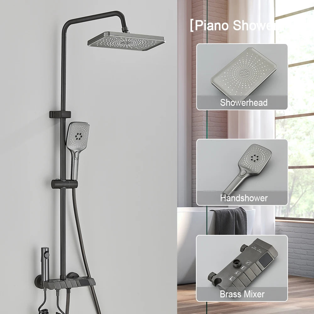 Grey Piano Digital Shower Set Intelligent Brass Bathroom Faucets Hot Cold Waterfall Tap Rainfall White Shower System Chuveiro