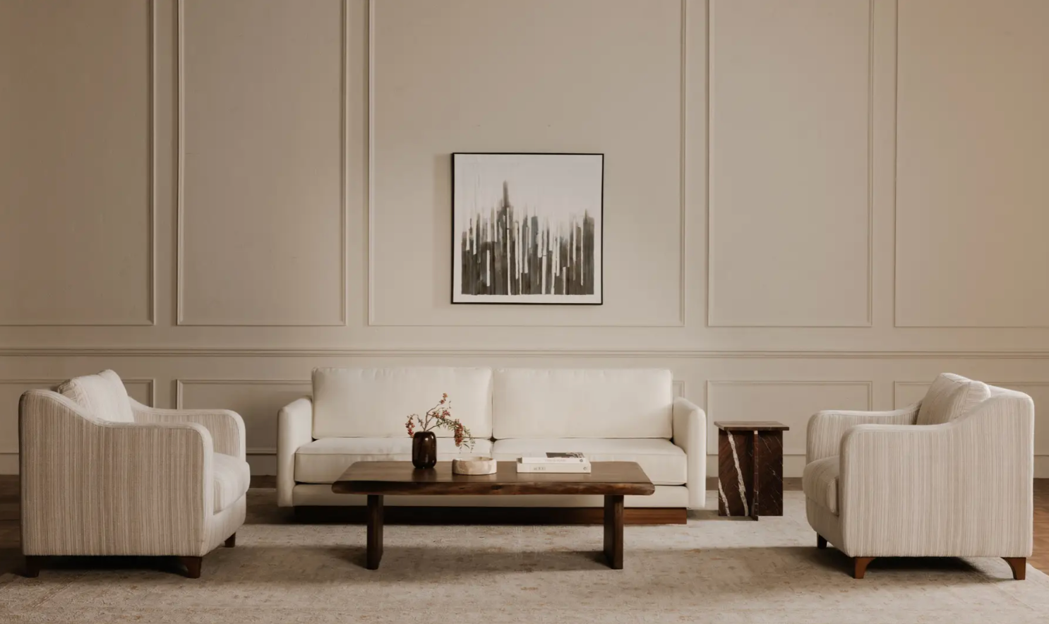 Inspired by traditional and transitional influences, the Hewitt accent chair offers timeless simplicity and commercial appeal with highly textured micro boucle upholstery. It has removable and reversible cushions for versatile comfort, a gentle slope in the arms and high back for an inviting posture, and curved solid birch legs that add elegance to the structure.