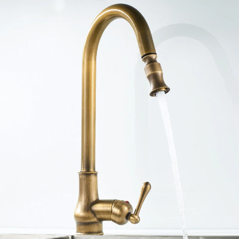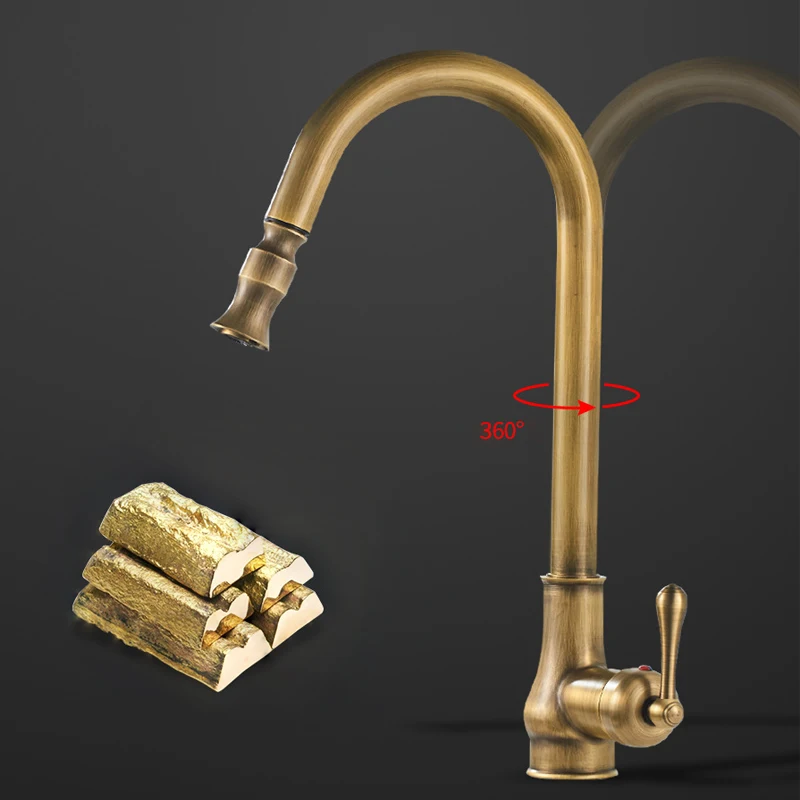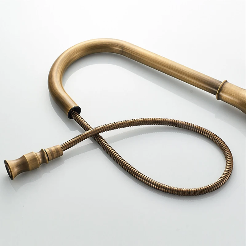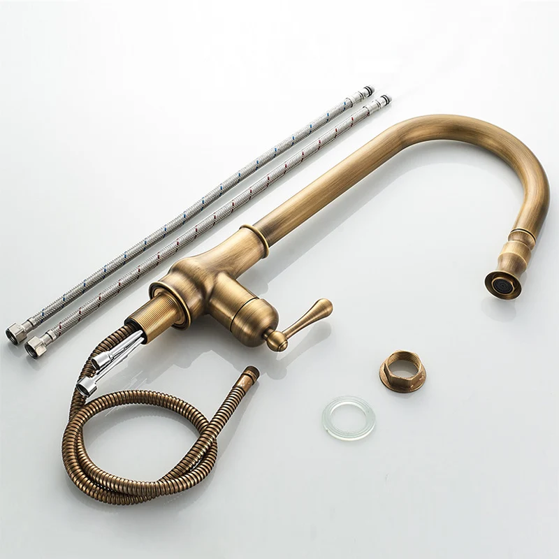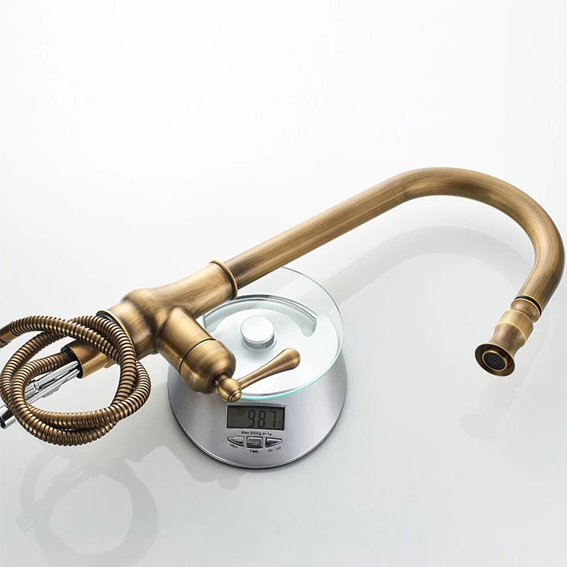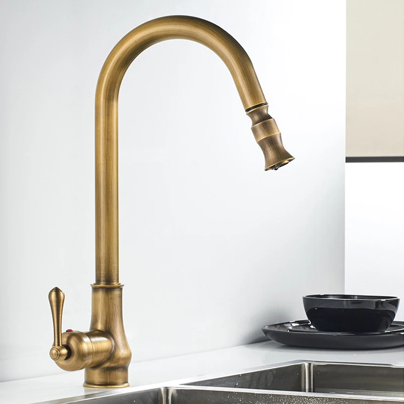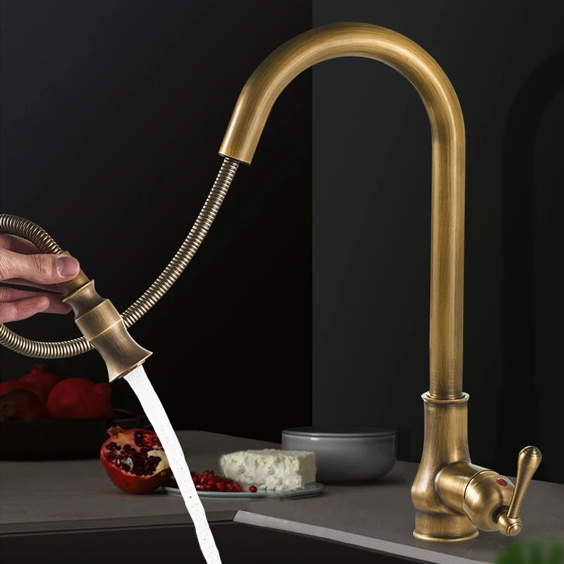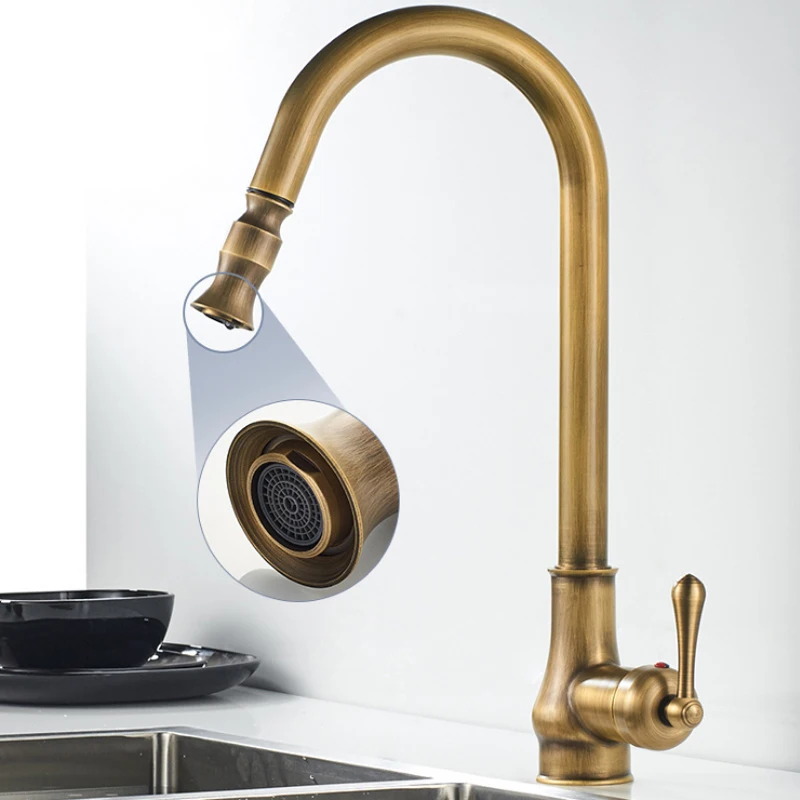Hotaan Antique Brass Kitchen Faucet Single Hole Pull Out Spout Copper Kitchen Sink Mixer Tap with Stream Sprayer Head