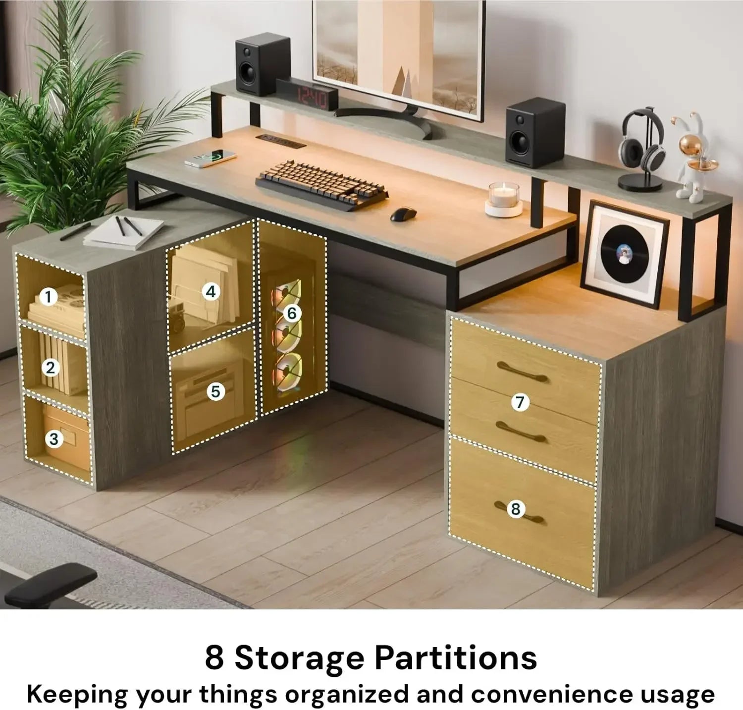 L Shaped Computer Desk with 3 Drawers, 65.7" Large Desk with LED Lights and Power Outlet