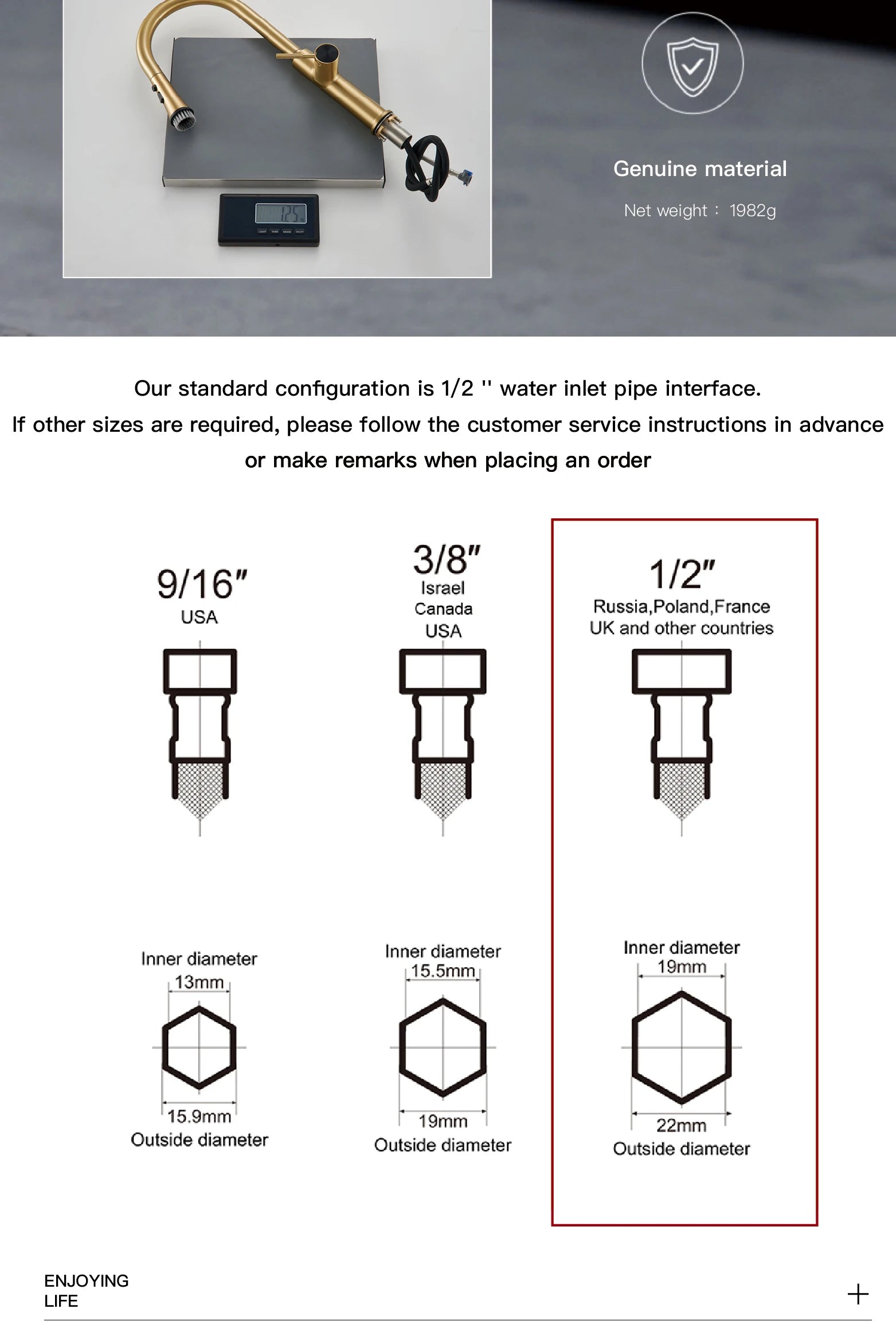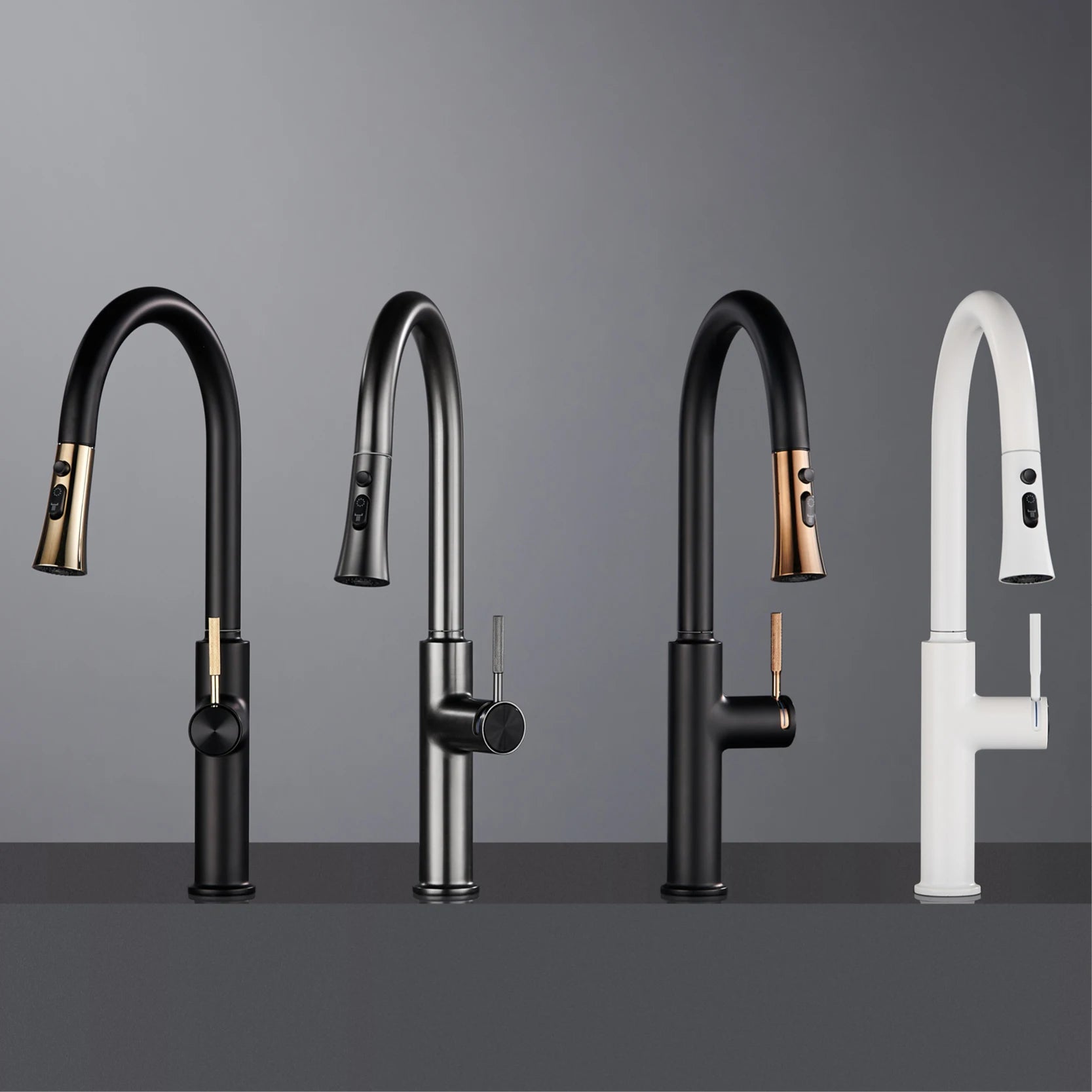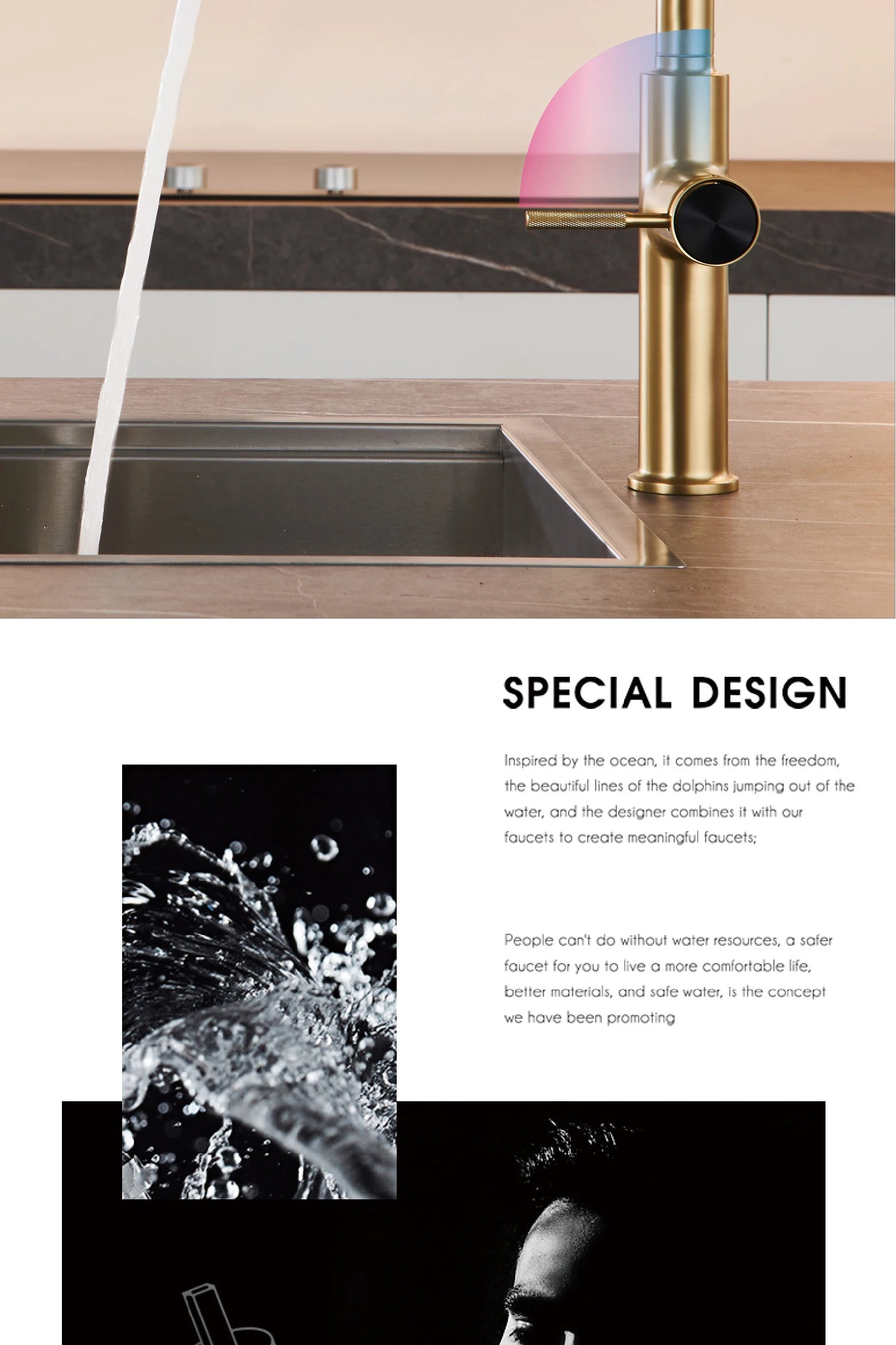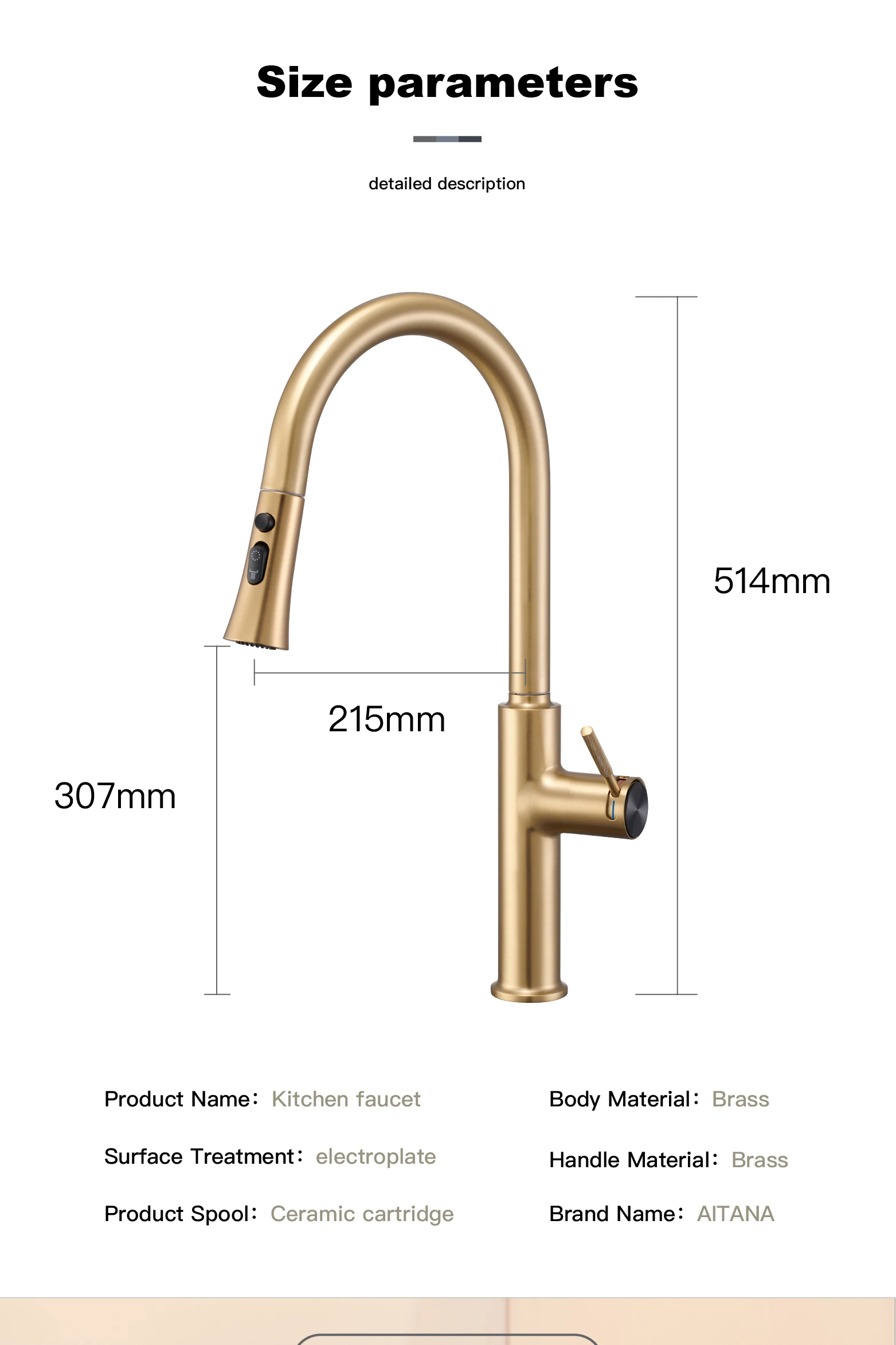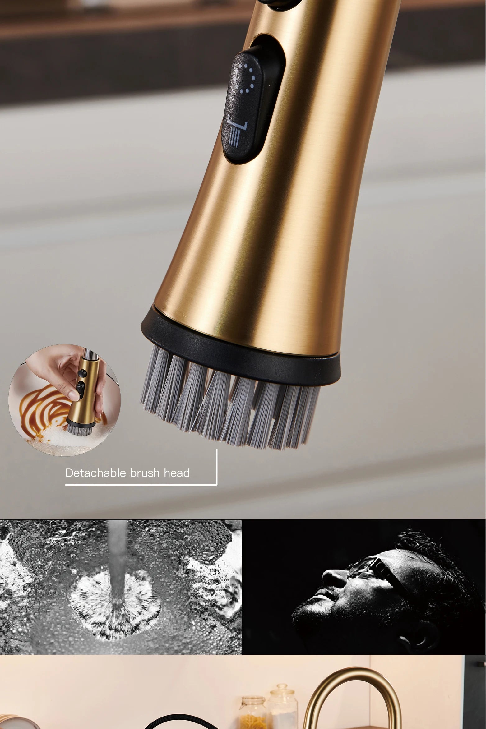 Luxury brushed gold kitchen faucet with pull-out design, 1-hole single handle cold and hot dual control dual function sink Tap