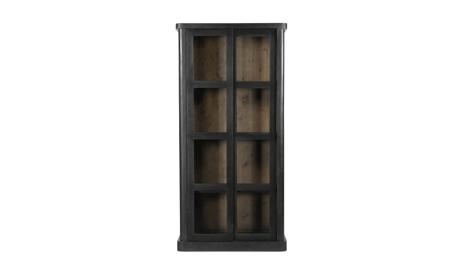 The Mona tall cabinet elegantly merges rustic charm with modern design, adding a contemporary touch. Its sleek black frame, rounded corners, and warm brown interior deliver a sophisticated contrast suitable for traditional and transitional settings. With sliding glass front doors, it optimizes space while elegantly displaying and protecting items inside.