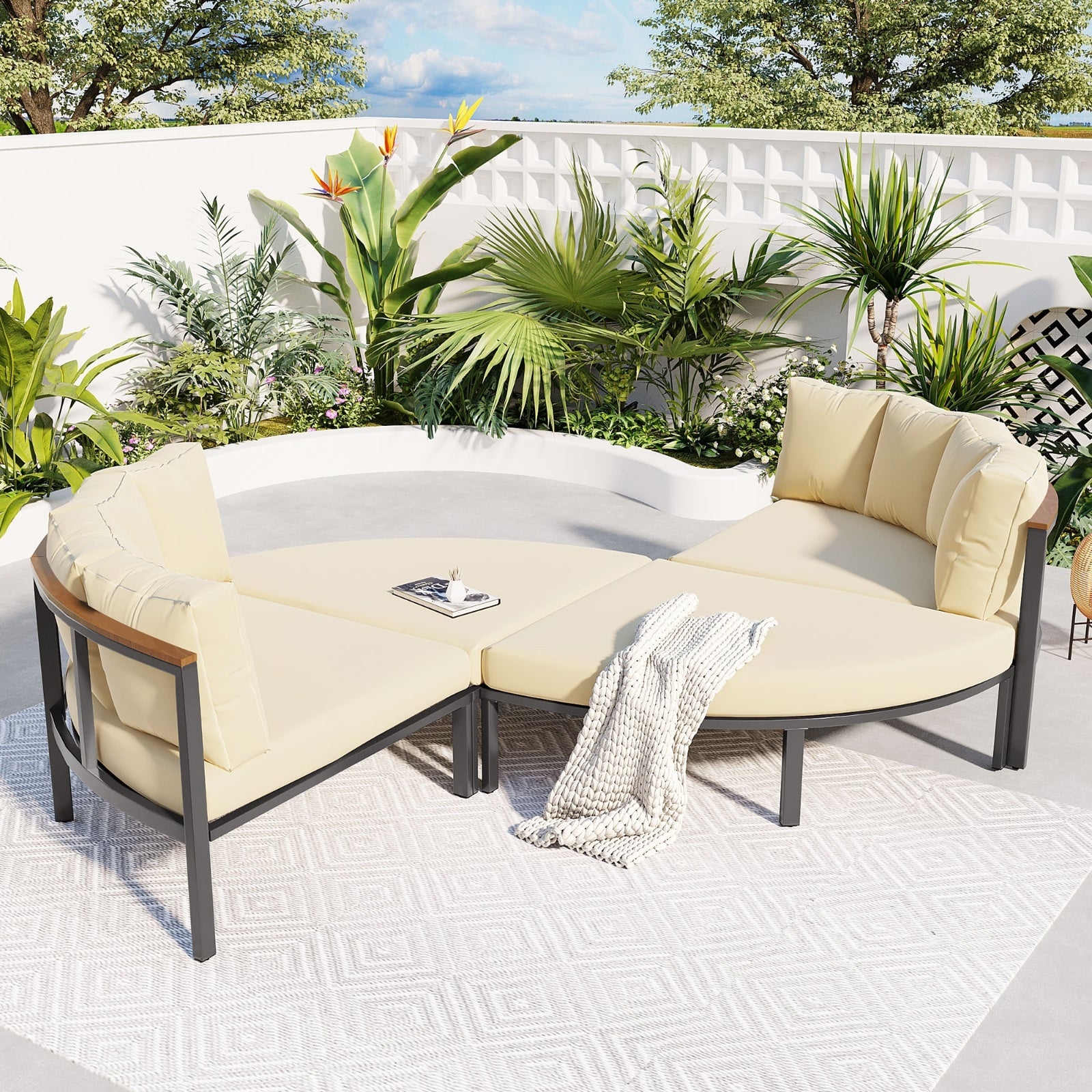 U-style Patio Furniture Set, 4 Piece Round Outdoor Conversation Set All Weather Metal Sectional Sofa