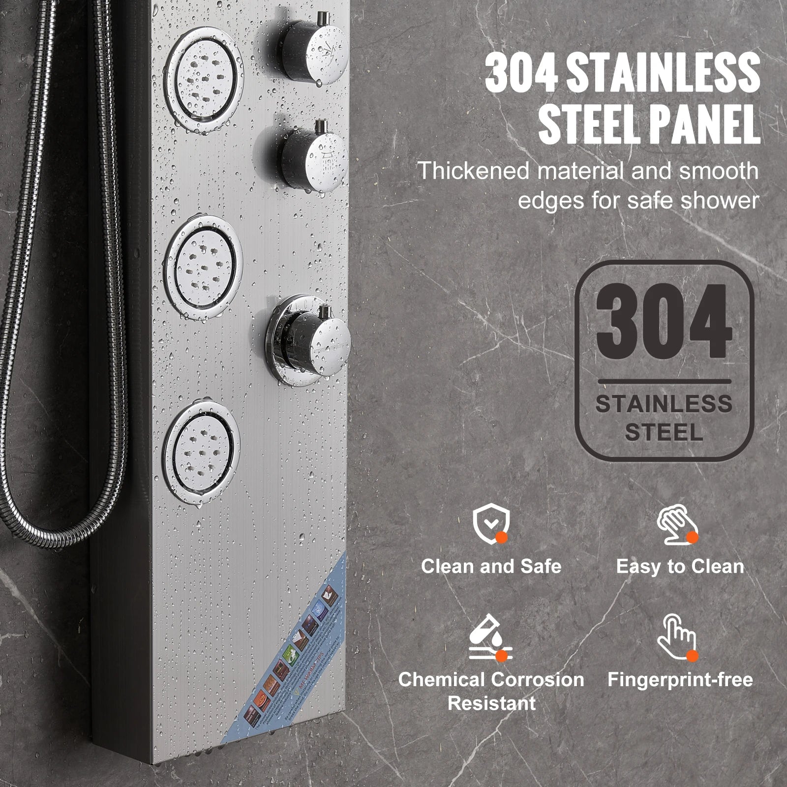 304 Stainless Steel Material: Crafted from high-quality 304 stainless steel for safety and durability. The shower panel tower is thick and resistant to fingerprints, rust, and corrosion. Ensuring easy cleaning for lasting beauty and hygiene.