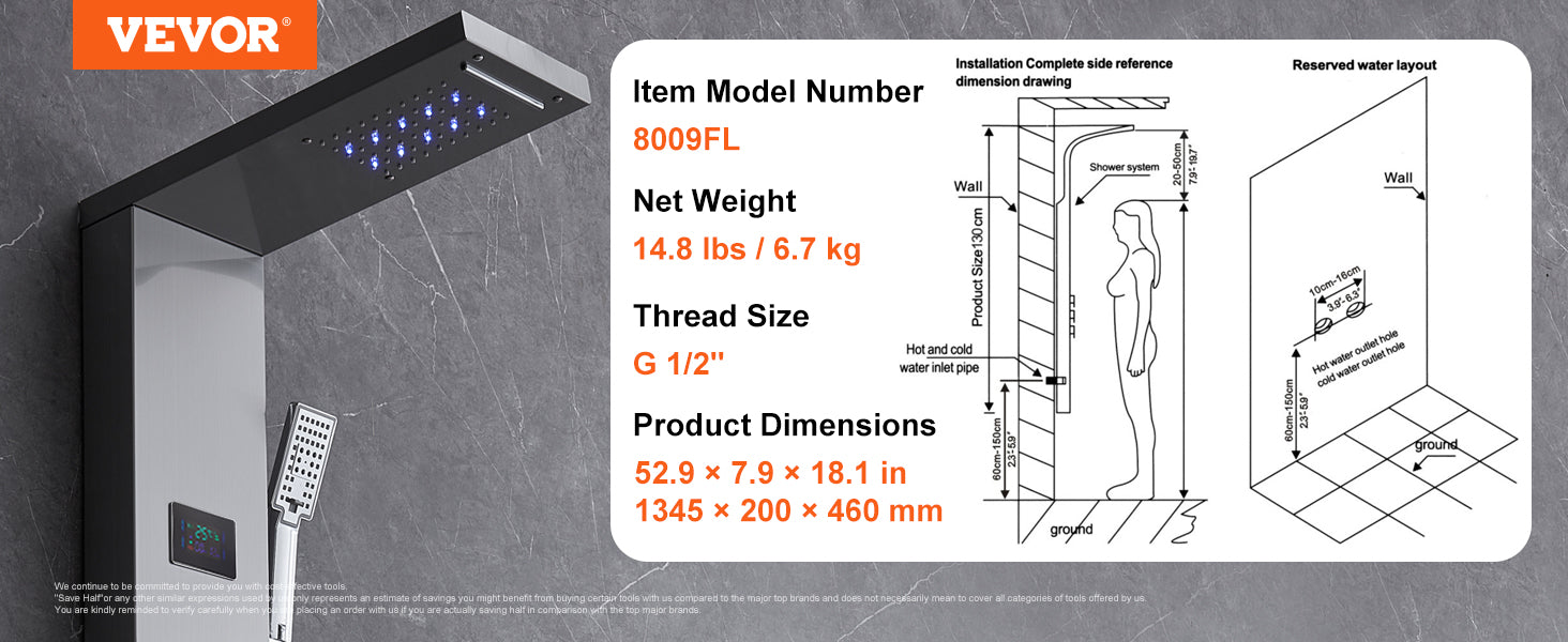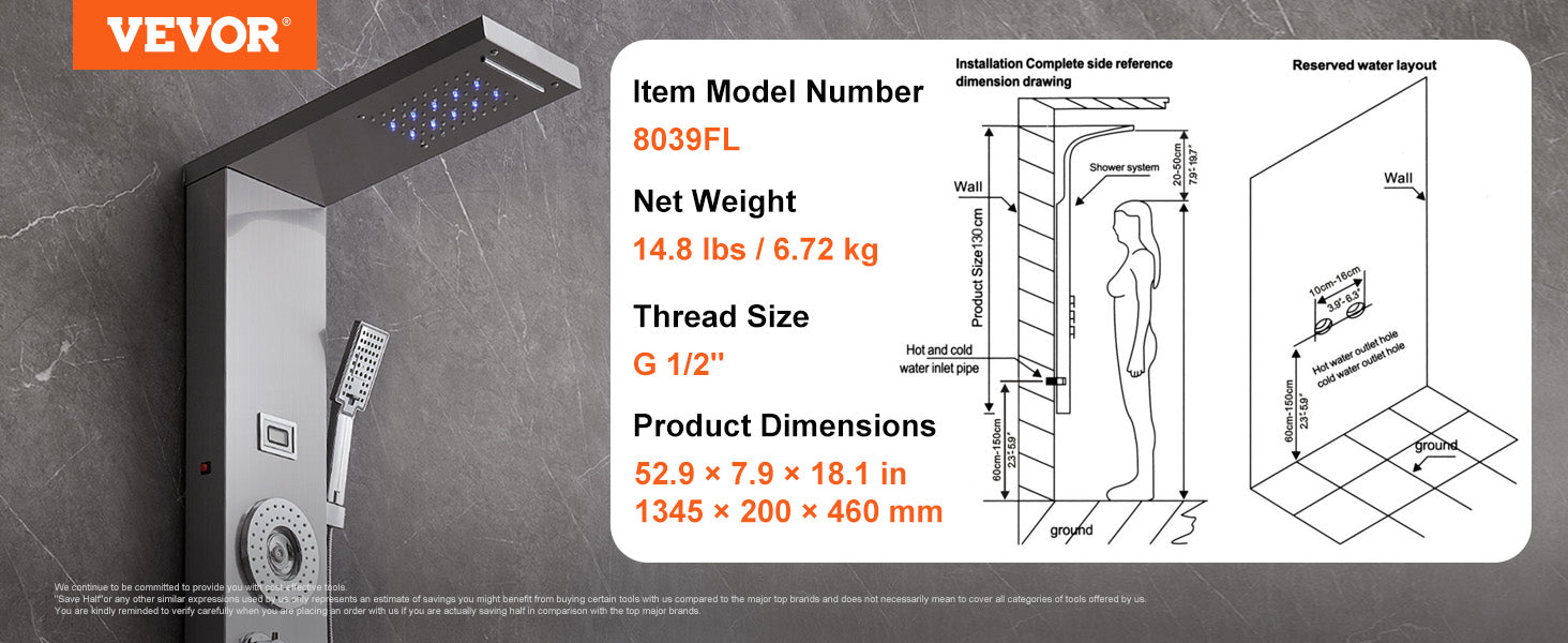 The G 1/2" interface thread size ensures a high water yield and stable pressure, making this shower system with body jets fit most bathroom fixtures and plumbing setups directly without needing a converter.