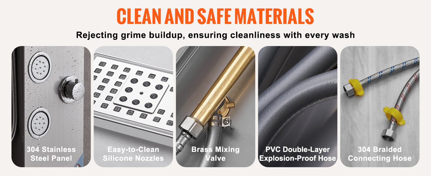 Constructed with a thickened 304 stainless steel panel for durability and hygiene, our shower panel resists corrosion and is easy to clean. The brass water mixing valve and PVC double explosion-proof pipe, along with a 304 stainless steel braided nozzle, ensure a robust and leak-proof system.