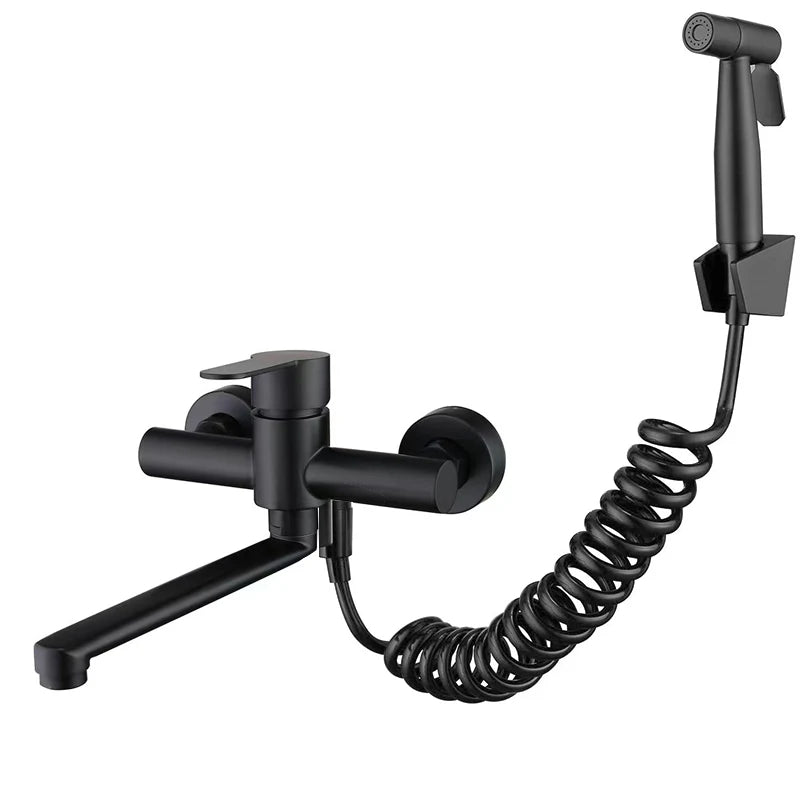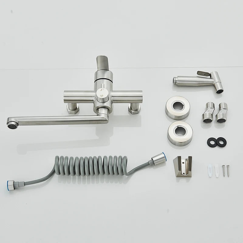 Wall Mount Kitchen Faucet Stainless Steel 360 Rotate Spout Bathroom Basin Faucet Hot and Cold Water Dual Hole with Sprayer Head