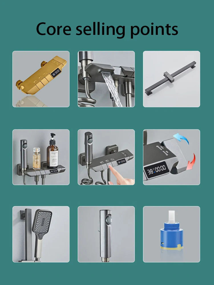 White Grey Deluxe Shower System Set Bathroom Rain Pressurized Shower Faucet Set Brass LED Digital Bathtub Shower Faucet Full Set