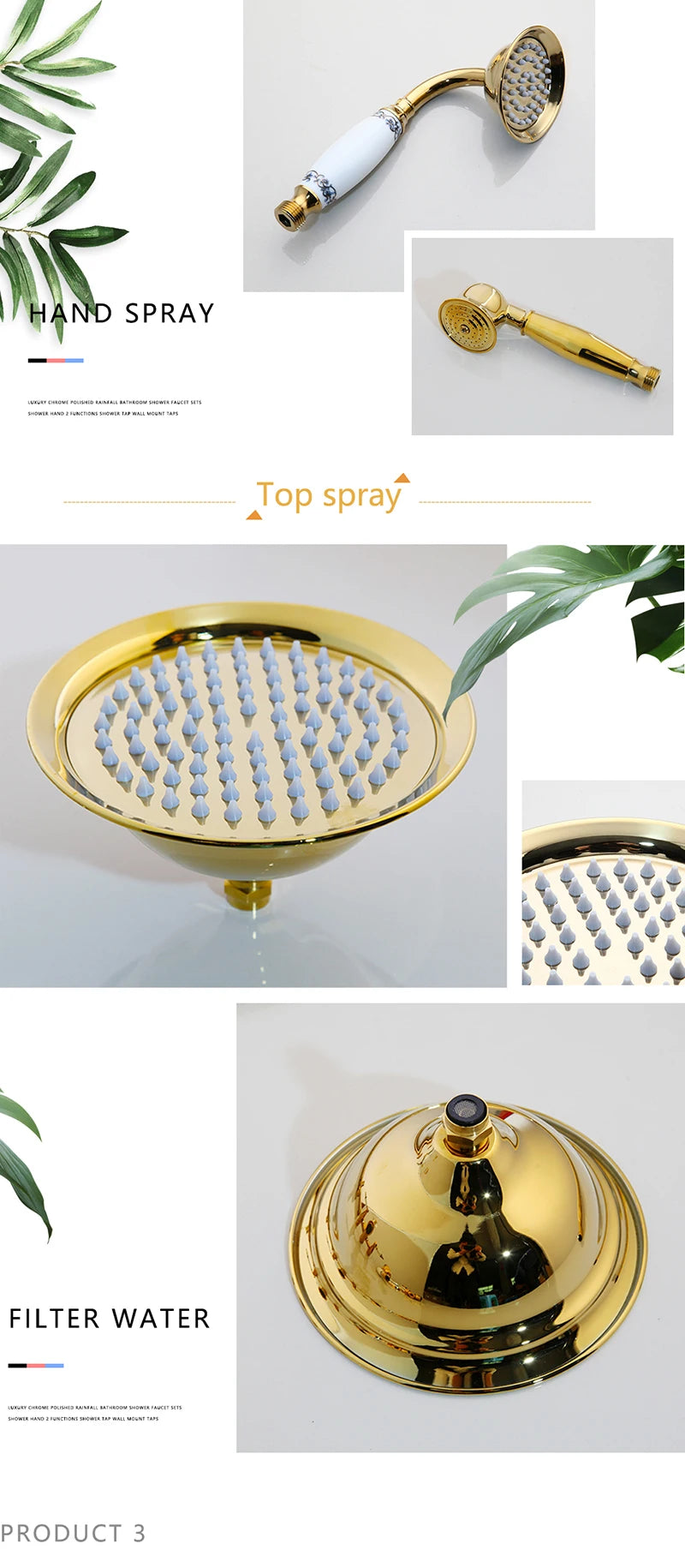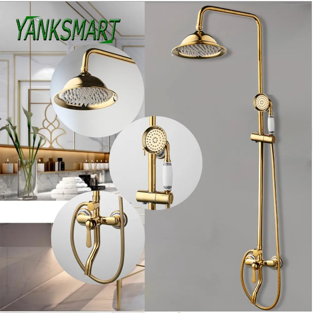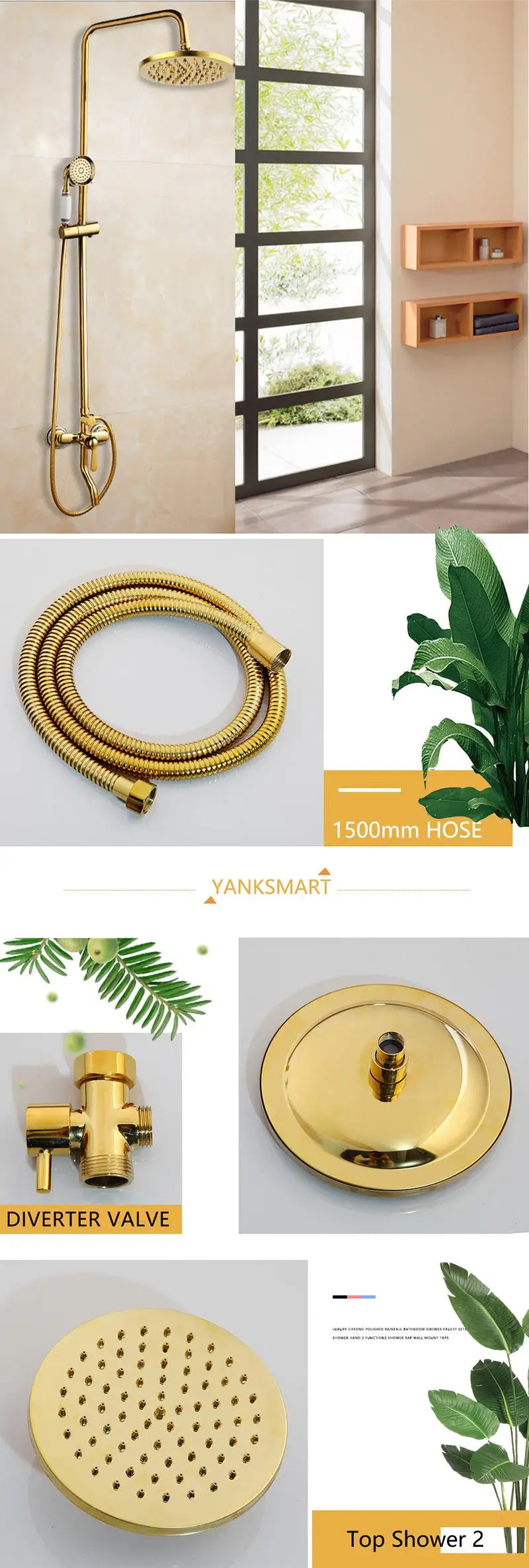 YANKSMART Gold Polished Bathroom Shower System Faucet Set Wall Mounted 3 Functions Rainfall Round Showers Head Mixer Water Tap