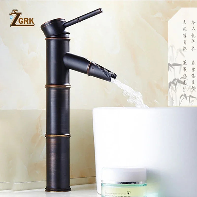 ZGRK Black Waterfall Bathroom Sink Faucet Vessel Tall Bamboo Water Tap Retro Brass Basin Faucets Single Hole Sink Mixer Tap